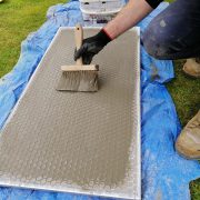 Apply EASYPrime to the back of the paving to a thickness of 1-2mm using a roller or brush. The paving should be then laid whilst wet, to maximise adhesion, and levelled into the bedding mortar layer with the required joint spacing.