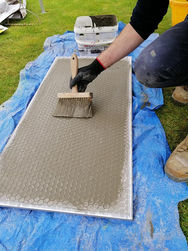 Apply EASYPrime to the back of the paving to a thickness of 1-2mm using a roller or brush. The paving should be then laid whilst wet, to maximise adhesion, and levelled into the bedding mortar layer with the required joint spacing.